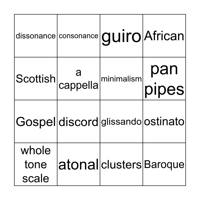 This bingo card has 16 words: atonal, ostinato, guiro, dissonance, Gospel, consonance, glissando, clusters, Scottish, a cappella, whole tone scale, African, discord, pan pipes, minimalism and Baroque.