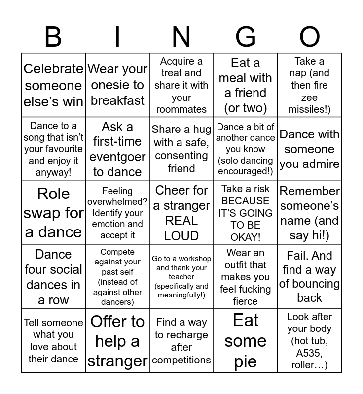 This bingo card has a free space and 24 words: Compete against your past self (instead of against other dancers), Offer to help a stranger, Share a hug with a safe, consenting friend, Tell someone what you love about their dance, Take a nap (and then fire zee missiles!), Celebrate someone else’s win, Dance to a song that isn’t your favourite and enjoy it anyway!, Wear your onesie to breakfast, Take a risk BECAUSE IT’S GOING TO BE OKAY!, Go to a workshop and thank your teacher (specifically and meaningfully!), Dance a bit of another dance you know (solo dancing encouraged!), Role swap for a dance, Wear an outfit that makes you feel fucking fierce, Fail. And find a way of bouncing back, Ask a first-time eventgoer to dance, Eat some pie, Remember someone’s name (and say hi!), Acquire a treat and share it with your roommates, Dance with someone you admire, Feeling overwhelmed? Identify your emotion and accept it, Look after your body (hot tub, A535, roller…), Dance four social dances in a row, Eat a meal with a friend (or two) and Find a way to recharge after competitions.