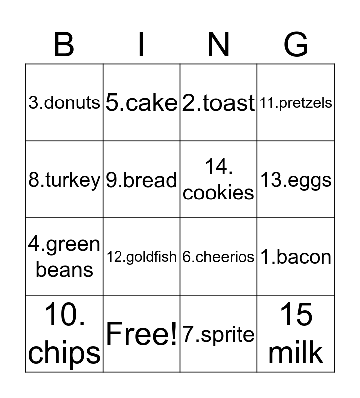 This bingo card has 16 words: Free!, 1.bacon, 2.toast, 3.donuts, 4.green beans, 5.cake, 6.cheerios, 7.sprite, 8.turkey, 9.bread, 10. chips, 11.pretzels, 12.goldfish, 13.eggs, 14. cookies and 15 milk.