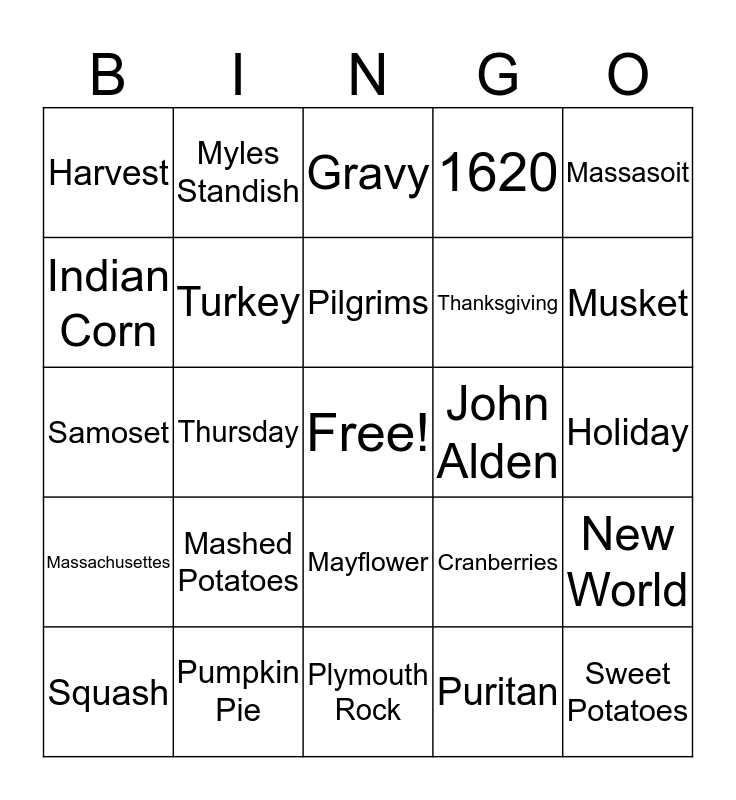 This bingo card has a free space and 24 words: Mashed Potatoes, Pumpkin Pie, Pilgrims, Squash, Massasoit, Harvest, Indian Corn, Myles Standish, John Alden, Mayflower, Thanksgiving, Samoset, Cranberries, New World, Turkey, Puritan, Holiday, Gravy, Musket, Thursday, Sweet Potatoes, Massachusettes, 1620 and Plymouth Rock.