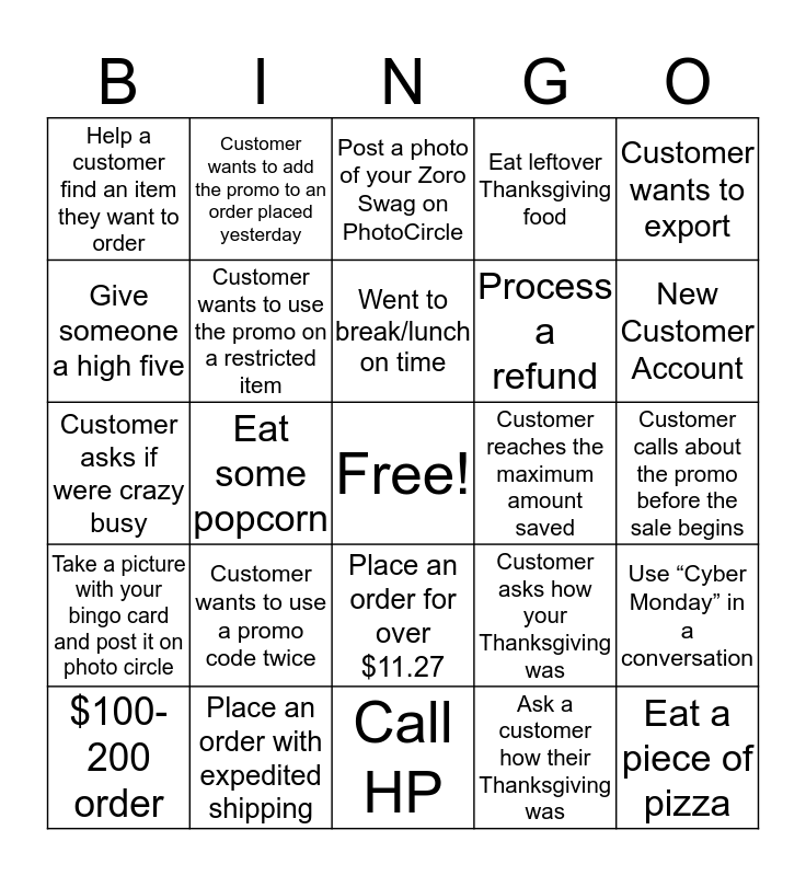 This bingo card has a free space and 24 words: Customer wants to use a promo code twice, Place an order with expedited shipping, Went to break/lunch on time, $100-200 order, Customer wants to export, Help a customer find an item they want to order, Give someone a high five, Customer wants to add the promo to an order placed yesterday, Customer reaches the maximum amount saved, Place an order for over $11.27, Process a refund, Customer asks if were crazy busy, Customer asks how your Thanksgiving was, Use “Cyber Monday” in a conversation, Customer wants to use the promo on a restricted item, Ask a customer how their Thanksgiving was, Customer calls about the promo before the sale begins, Post a photo of your Zoro Swag on PhotoCircle, New Customer Account, Eat some popcorn, Eat a piece of pizza, Take a picture with your bingo card and post it on photo circle, Eat leftover Thanksgiving food and Call HP.