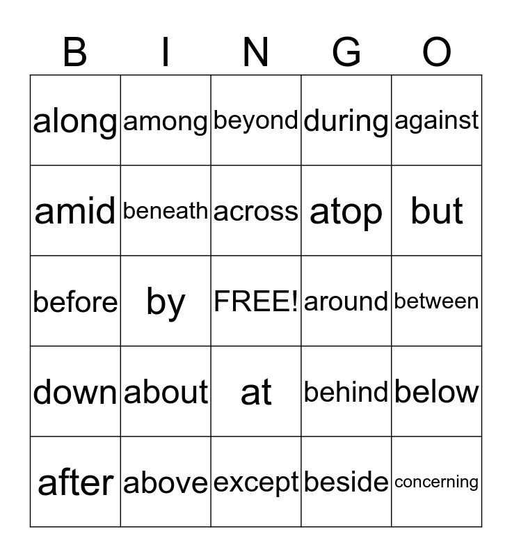 This bingo card has a free space and 24 words: about, above, across, after, against, along, amid, among, around, at, atop, before, behind, below, beneath, beside, between, beyond, but, by, concerning, down, during and except.