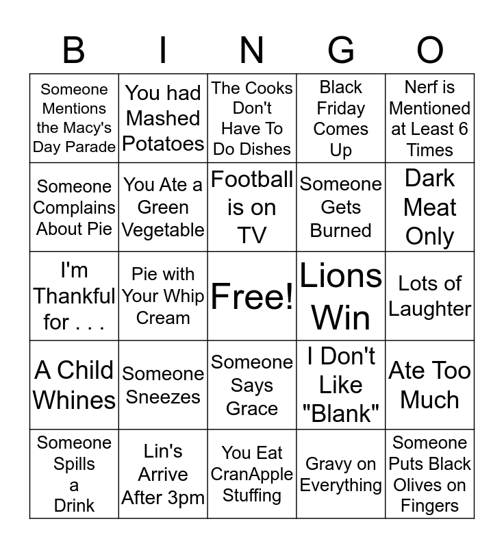 This bingo card has a free space and 24 words: Someone Sneezes, Lin's Arrive After 3pm, Football is on TV, Someone Spills a Drink, Nerf is Mentioned at Least 6 Times, Someone Mentions the Macy's Day Parade, Someone Complains About Pie, You had Mashed Potatoes, Lions Win, Someone Says Grace, Someone Gets Burned, I'm Thankful for . . ., I Don't Like "Blank", Ate Too Much, You Ate a Green Vegetable, Gravy on Everything, Lots of Laughter, The Cooks Don't Have To Do Dishes, Dark Meat Only, Pie with Your Whip Cream, Someone Puts Black Olives on Fingers, A Child Whines, Black Friday Comes Up and You Eat CranApple Stuffing.