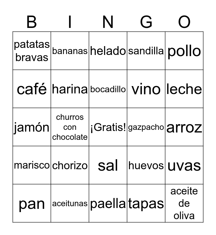 This bingo card has a free space and 24 words: pan, chorizo, bocadillo, tapas, pollo, patatas bravas, bananas, helado, gazpacho, arroz, jamón, harina, huevos, uvas, café, aceitunas, paella, sandilla, leche, marisco, churros con chocolate, sal, vino and aceite de oliva.