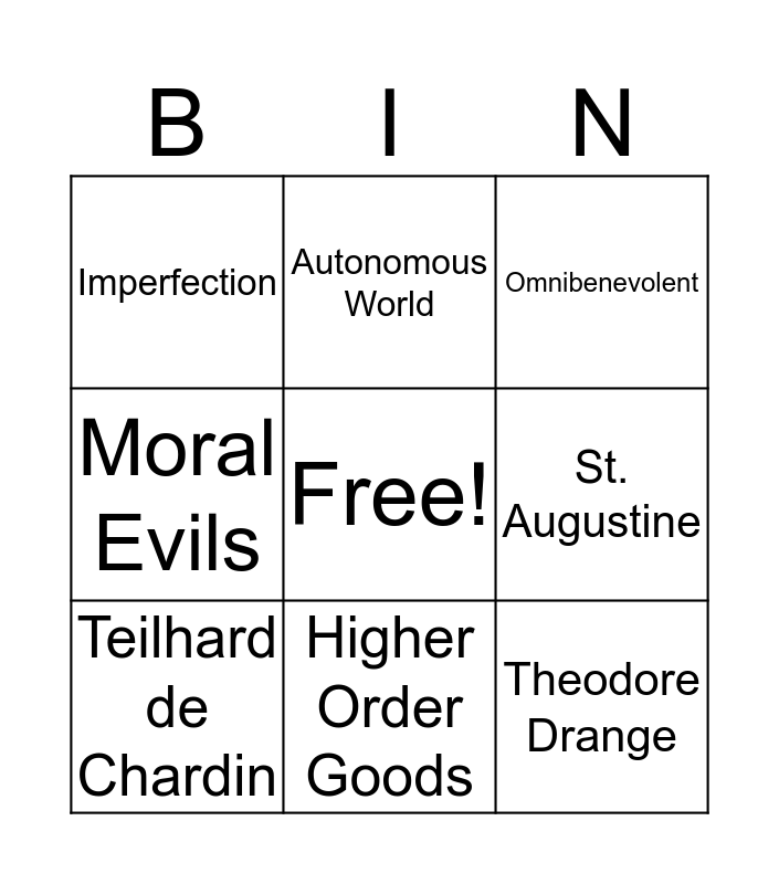 This bingo card has a free space and 18 words: Omniscient, Omnipotent, Omnibenevolent, Imperfection, Natural Evils, Moral Evils, Unbelief, Autonomous World, Higher Order Goods, Free Will, Divine HIddenness, Theodore Drange, Aquinas, St. Augustine, Teilhard de Chardin, Gospel of Mark, Messianic Secret and Analogically.