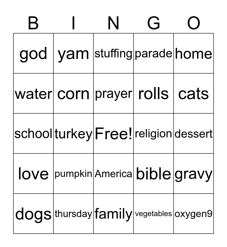 This bingo card has a free space and 24 words: pumpkin, thursday, prayer, dogs, home, god, water, yam, religion, America, rolls, school, bible, gravy, corn, vegetables, dessert, stuffing, cats, turkey, oxygen9, love, parade and family.