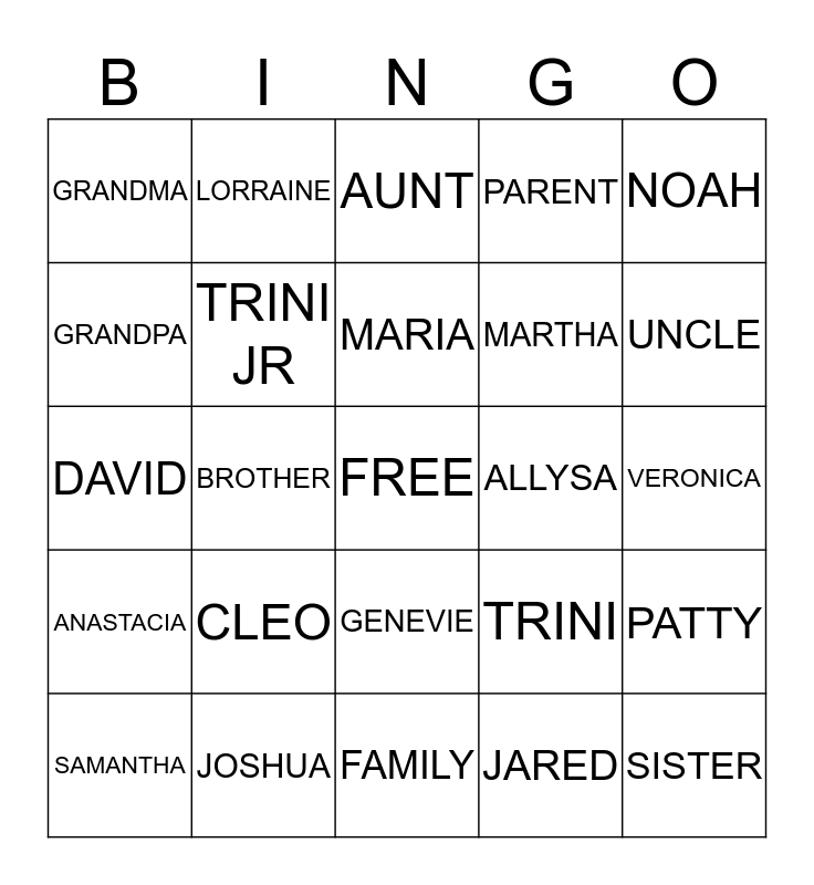 This bingo card has a free space and 24 words: CLEO, JOSHUA, MARIA, SAMANTHA, NOAH, GRANDMA, GRANDPA, LORRAINE, ALLYSA, GENEVIE, MARTHA, DAVID, TRINI, PATTY, TRINI JR, JARED, VERONICA, AUNT, UNCLE, BROTHER, SISTER, ANASTACIA, PARENT and FAMILY.