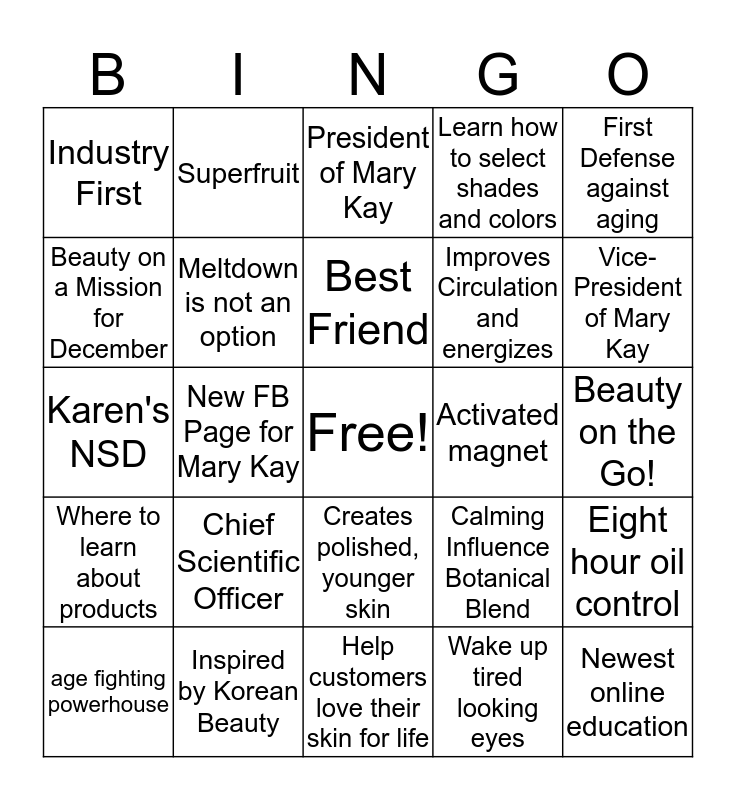This bingo card has a free space and 24 words: Chief Scientific Officer, Inspired by Korean Beauty, Best Friend, age fighting powerhouse, First Defense against aging, Industry First, Beauty on a Mission for December, Superfruit, Activated magnet, Creates polished, younger skin, Improves Circulation and energizes, Karen's NSD, Calming Influence Botanical Blend, Eight hour oil control, Meltdown is not an option, Wake up tired looking eyes, Beauty on the Go!, President of Mary Kay, Vice-President of Mary Kay, New FB Page for Mary Kay, Newest online education, Where to learn about products, Learn how to select shades and colors and Help customers love their skin for life.