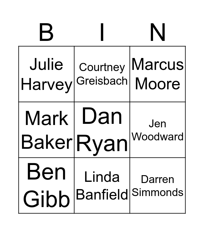 This bingo card has 13 words: Kylie Boyle, Ashton Whiley, Ben Gibb, Courtney Greisbach, Mark Baker, Dan Ryan, Darren Simmonds, Rob Shaw, Linda Banfield, Julie Harvey, Jen Woodward, Marcus Moore and Gavin Stone.