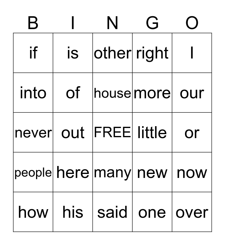 This bingo card has a free space and 24 words: here, his, house, how, I, if, into, is, little, many, more, never, new, now, of, one, or, other, our, out, over, people, right and said.