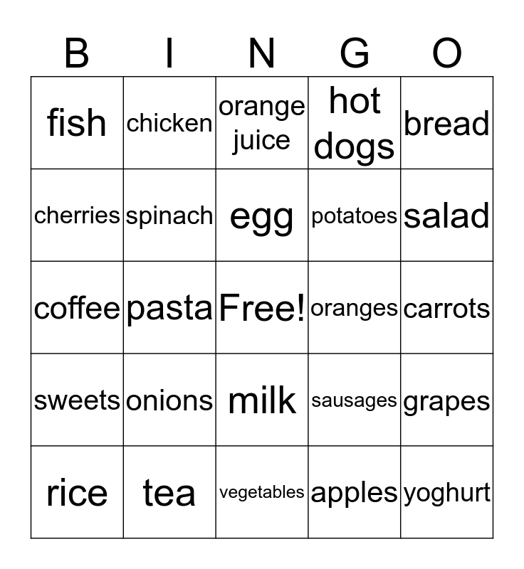 This bingo card has a free space and 24 words: onions, tea, egg, rice, bread, fish, cherries, chicken, oranges, milk, potatoes, coffee, sausages, grapes, spinach, apples, carrots, orange juice, salad, pasta, yoghurt, sweets, hot dogs and vegetables.