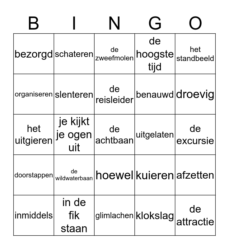 This bingo card has 36 words: het paspoort, de douane, de controle, slenteren, kuieren, doorstappen, de reisleider, diverse, het standbeeld, voldaan, je kijkt je ogen uit, de hoogste tijd, de stemming, uitgelaten, droevig, bezorgd, de attractie, de wildwaterbaan, de achtbaan, de zweefmolen, de excursie, afzetten, in de fik staan, inmiddels, glimlachen, schateren, het uitgieren, opgelucht, benauwd, organiseren, de wandeltocht, acuut, klokslag, hoewel, het geheime wapen and het valt vies tegen.