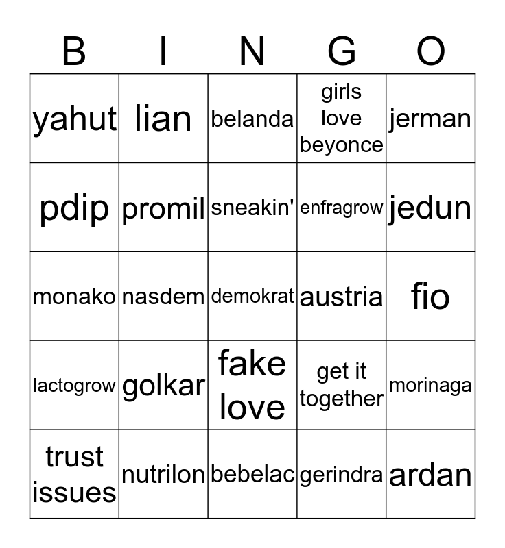 This bingo card has a free space and 24 words: golkar, nutrilon, sneakin', trust issues, jerman, yahut, pdip, lian, austria, fake love, enfragrow, monako, get it together, morinaga, promil, gerindra, fio, belanda, jedun, nasdem, ardan, lactogrow, girls love beyonce and bebelac.