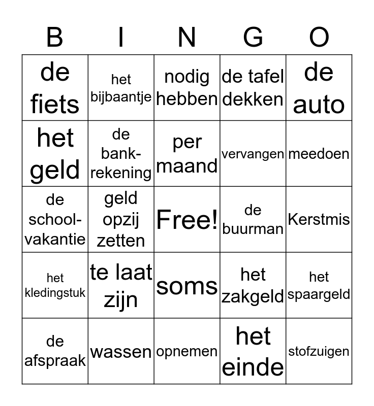 This bingo card has a free space and 24 words: te laat zijn, wassen, per maand, de afspraak, de auto, de fiets, het geld, het bijbaantje, de buurman, soms, vervangen, de school-vakantie, het zakgeld, het spaargeld, de bank-rekening, het einde, Kerstmis, nodig hebben, meedoen, geld opzij zetten, stofzuigen, het kledingstuk, de tafel dekken and opnemen.