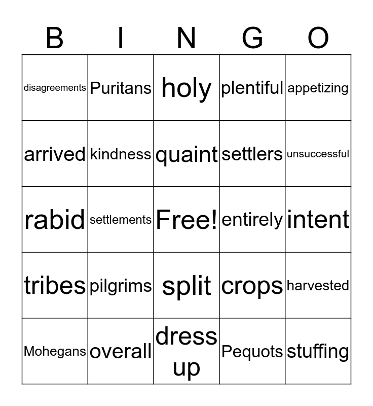 This bingo card has a free space and 46 words: looked forward, stuffing, collard greens, dress up, pilgrims, reenact, Puritans, Mayflower, arrived, Plymouth, kindness, plentiful, harvested, crops, feast, giggled, quaint, entirely, mourning, appetizing, settlements, Pequots, disagreements, settlers, ultimately, unsuccessful, Mohegans, aligned, split, tribes, slain, slaves, trader, kidnapping, elderly, overall, intent, genocide, unholy, devil-like, dehumanization, holy, rabid, thankful, roots and heartbroken.