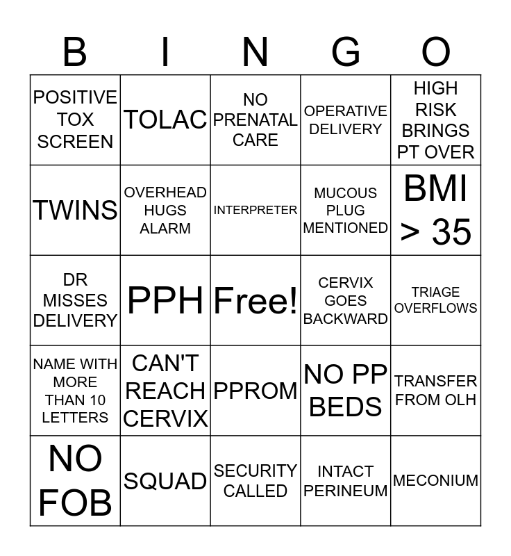 This bingo card has a free space and 24 words: CAN'T REACH CERVIX, SQUAD, INTERPRETER, NO FOB, HIGH RISK BRINGS PT OVER, POSITIVE TOX SCREEN, TWINS, TOLAC, CERVIX GOES BACKWARD, PPROM, MUCOUS PLUG MENTIONED, DR MISSES DELIVERY, NO PP BEDS, TRANSFER FROM OLH, OVERHEAD HUGS ALARM, INTACT PERINEUM, TRIAGE OVERFLOWS, NO PRENATAL CARE, BMI > 35, PPH, MECONIUM, NAME WITH MORE THAN 10 LETTERS, OPERATIVE DELIVERY and SECURITY CALLED.