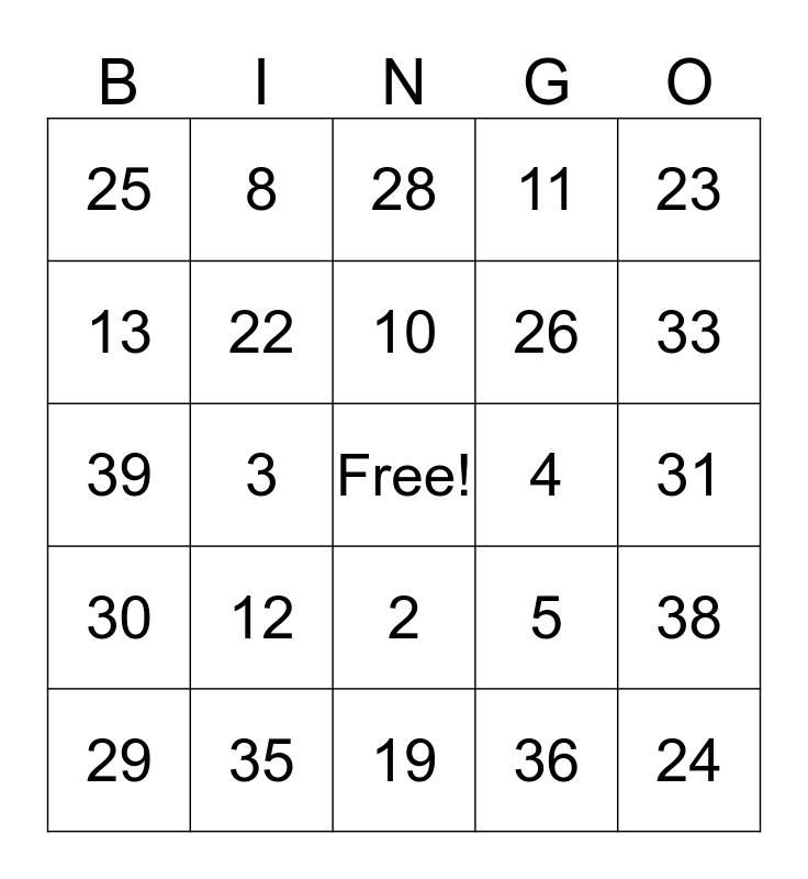 This bingo card has a free space and 39 words: 1, 9, 16, 22, 29, 2, 10, 17, 23, 30, 3, 11, 24, 31, 4, 12, 18, 25, 32, 5, 13, 19, 26, 33, 7, 14, 20, 27, 34, 8, 15, 21, 28, 35, 36, 37, 38, 39 and 40.