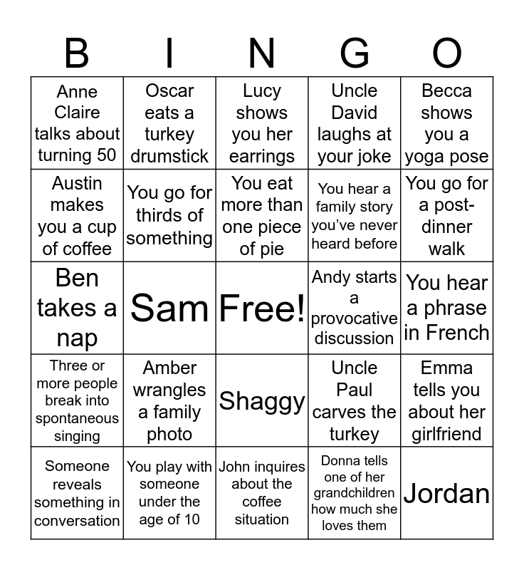 This bingo card has a free space and 27 words: Uncle Paul carves the turkey, Fife sings a Taylor Swift song, You hear a family story you’ve never heard before, John inquires about the coffee situation, Austin makes you a cup of coffee, Lucy shows you her earrings, Oscar eats a turkey drumstick, Three or more people break into spontaneous singing, Andy starts a provocative discussion, Emma tells you about her girlfriend, Ben takes a nap, Uncle David laughs at your joke, Someone reveals something in conversation, You play with someone under the age of 10, You go for a post-dinner walk, Wendell takes a bad photo, You go for thirds of something, You eat more than one piece of pie, Amber wrangles a family photo, Anne Claire talks about turning 50, You hear a phrase in French, Donna tells one of her grandchildren how much she loves them, Sam, Jordan, Shaggy, Becca shows you a yoga pose and Andy carries a child on his shoulders.