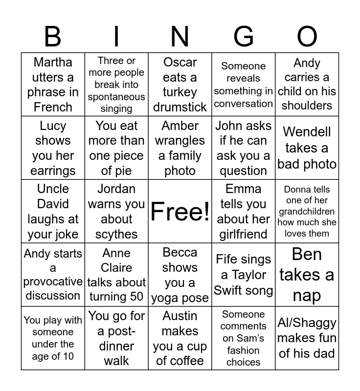 This bingo card has a free space and 27 words: Fife sings a Taylor Swift song, You hear a family story you’ve never heard before, John asks if he can ask you a question, Austin makes you a cup of coffee, Lucy shows you her earrings, Oscar eats a turkey drumstick, Three or more people break into spontaneous singing, Andy starts a provocative discussion, Emma tells you about her girlfriend, Ben takes a nap, Uncle David laughs at your joke, Someone reveals something in conversation, You play with someone under the age of 10, You go for a post-dinner walk, Wendell takes a bad photo, You go for thirds of something, You eat more than one piece of pie, Amber wrangles a family photo, Anne Claire talks about turning 50, Martha utters a phrase in French, Donna tells one of her grandchildren how much she loves them, Someone comments on Sam’s fashion choices, Jordan warns you about scythes, Al/Shaggy makes fun of his dad, Becca shows you a yoga pose, Andy carries a child on his shoulders and Uncle Paul wisecracks.