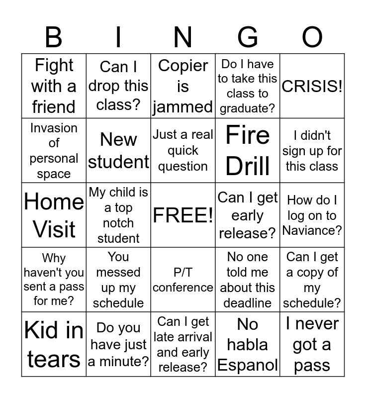 This bingo card has a free space and 24 words: You messed up my schedule, Do you have just a minute?, Just a real quick question, Kid in tears, CRISIS!, Fight with a friend, Invasion of personal space, Can I drop this class?, Can I get early release?, P/T conference, Fire Drill, Home Visit, No one told me about this deadline, Can I get a copy of my schedule?, New student, No habla Espanol, How do I log on to Naviance?, Copier is jammed, I didn't sign up for this class, My child is a top notch student, I never got a pass, Why haven't you sent a pass for me?, Do I have to take this class to graduate? and Can I get late arrival and early release?.