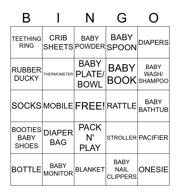 This bingo card has a free space and 24 words: DIAPER BAG, BABY MONITOR, BABY PLATE/ BOWL, BOTTLE, DIAPERS, TEETHING RING, RUBBER DUCKY, CRIB SHEETS, RATTLE, PACK N' PLAY, BABY BOOK, SOCKS, STROLLER, PACIFIER, THERMOMETER, BABY NAIL CLIPPERS, BABY BATHTUB, BABY POWDER, BABY WASH/ SHAMPOO, MOBILE, ONESIE, BOOTIES BABY SHOES, BABY SPOON and BLANKET.