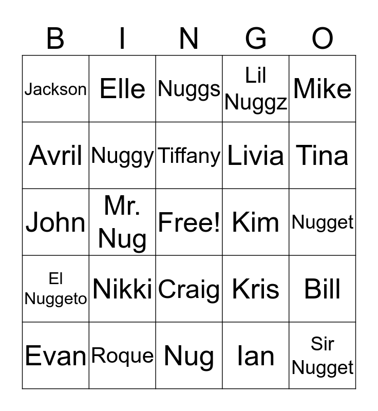 This bingo card has a free space and 24 words: Nikki, Roque, Tiffany, Evan, Mike, Jackson, Avril, Elle, Kim, Craig, Livia, John, Kris, Bill, Nuggy, Ian, Nugget, Nuggs, Tina, Mr. Nug, Sir Nugget, El Nuggeto, Lil Nuggz and Nug.