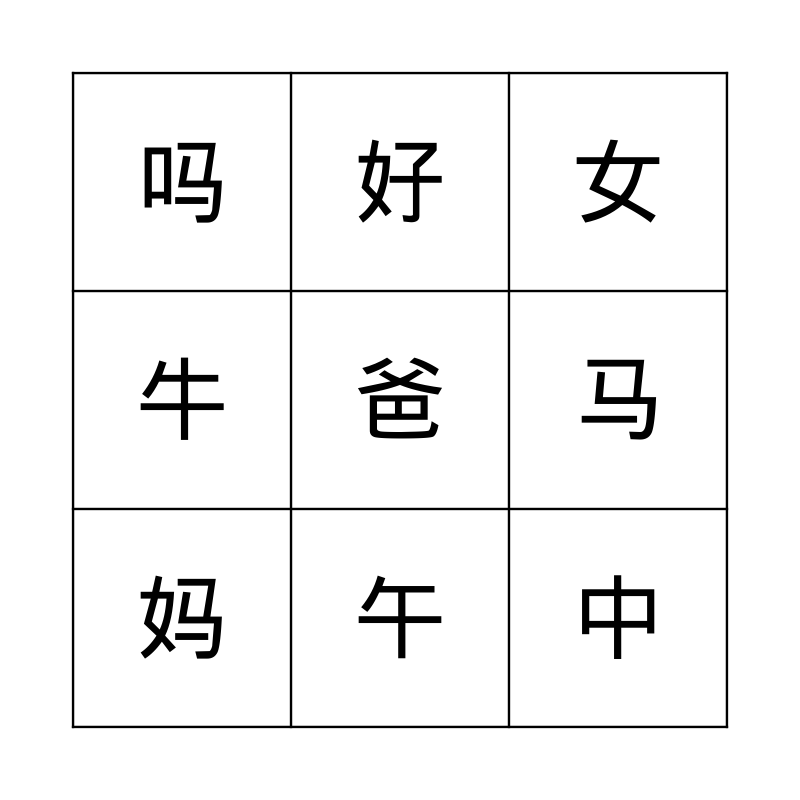 This bingo card has a free space and 8 words: 马, 女, 好, 妈, 吗, 中, 牛 and 午.