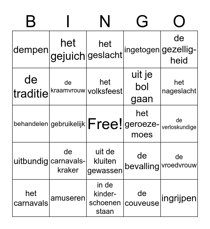 This bingo card has a free space and 24 words: de carnavals-kraker, amuseren, het volksfeest, het carnavals, de gezellig-heid, dempen, de traditie, het gejuich, het geroeze-moes, uit de kluiten gewassen, uit je bol gaan, behandelen, de bevalling, de vroedvrouw, de kraamvrouw, de couveuse, de verloskundige, het geslacht, het nageslacht, gebruikelijk, ingrijpen, uitbundig, ingetogen and in de kinder-schoenen staan.