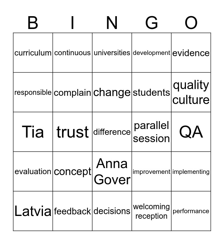 This bingo card has a free space and 24 words: concept, feedback, change, Latvia, evidence, curriculum, responsible, continuous, parallel session, Anna Gover, students, Tia, improvement, implementing, complain, welcoming reception, QA, universities, quality culture, trust, performance, evaluation, development and decisions.