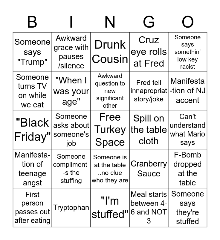 This bingo card has a free space and 24 words: First person passes out after eating, Someone compliment--s the stuffing, Awkward question to new significant other, Meal starts between 4-6 and NOT 3, Someone says somethin' low key racist, Someone says "Trump", Awkward grace with pauses /silence, Drunk Cousin, Spill on the table cloth, Can't understand what Mario says, "Black Friday", "When I was your age", Cranberry Sauce, F-Bomb dropped at the table, Someone turns TV on while we eat, Tryptophan, "I'm stuffed", Cruz eye rolls at Fred, Manifesta -tion of NJ accent, Manifesta-tion of teenage angst, Someone asks about someone's job, Someone is at the table ..no clue who they are, Fred tell innapropriat story/joke and Someone says they're stuffed.