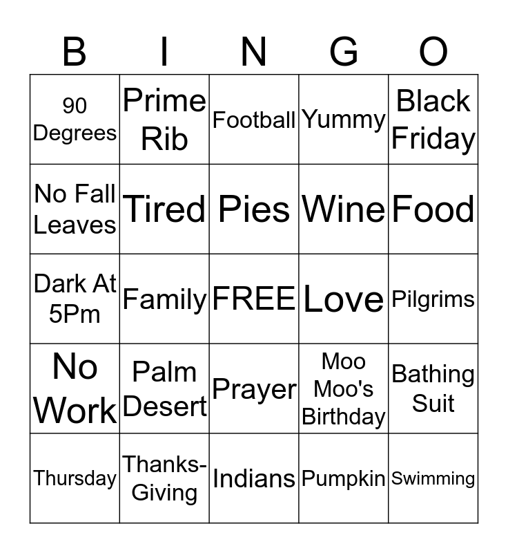 This bingo card has a free space and 24 words: Palm Desert, Thanks-Giving, Pies, Thursday, Black Friday, 90 Degrees, No Fall Leaves, Prime Rib, Love, Prayer, Wine, Dark At 5Pm, Moo Moo's Birthday, Bathing Suit, Tired, Pumpkin, Pilgrims, Football, Food, Family, Swimming, No Work, Yummy and Indians.