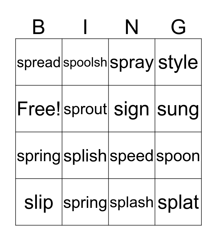 This bingo card has 16 words: spring, spoon, spray, spread, spring, spoolsh, speed, splash, Free!, sprout, slip, style, splish, sung, sign and splat.