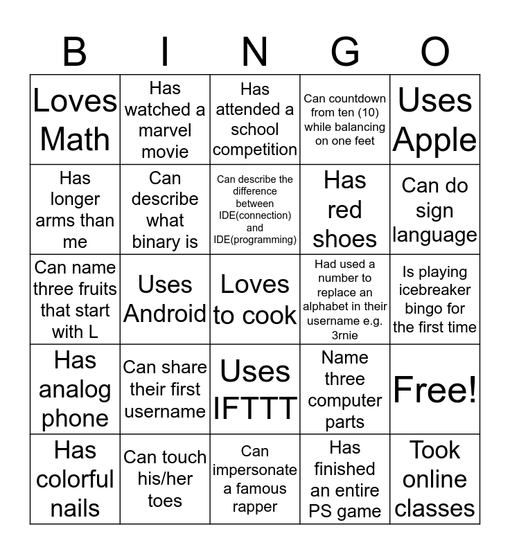 This bingo card has 28 words: Free!, Has coded in COBOL before, Has red shoes, Has finished an entire PS game, Has longer arms than me, Has attended a school competition, Has watched a marvel movie, Has analog phone, Had used a number to replace an alphabet in their username e.g. 3rnie, Has colorful nails, Can name three fruits that start with L, Can countdown from ten (10) while balancing on one feet, Can touch his/her toes, Can impersonate a famous rapper, Can do sign language, Can share their favorite map in MMO RPG Game they play., Can share their first username, Can describe what binary is, Can describe the difference between IDE(connection) and IDE(programming), Uses IFTTT, Loves Math, Took online classes, Loves to cook, Uses Android, Is playing icebreaker bingo for the first time, Name three computer parts, Uses Apple and Loves smiling.