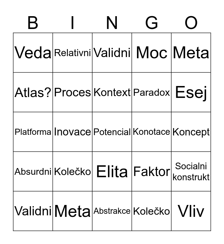 This bingo card has 30 words: Validni, Marx, Kontext, Pravda, Meta, Veda, Relativni, Elita, Konotace, Vliv, Absurdni, Proces, Diskurz, Kolečko, Socialni konstrukt, Determinizmus, Inovace, Potencial, Faktor, Esej, Platforma, Meta, Validni, Paradox, Koncept, Atlas?, Kolečko, Abstrakce, Moc and Fenomén.