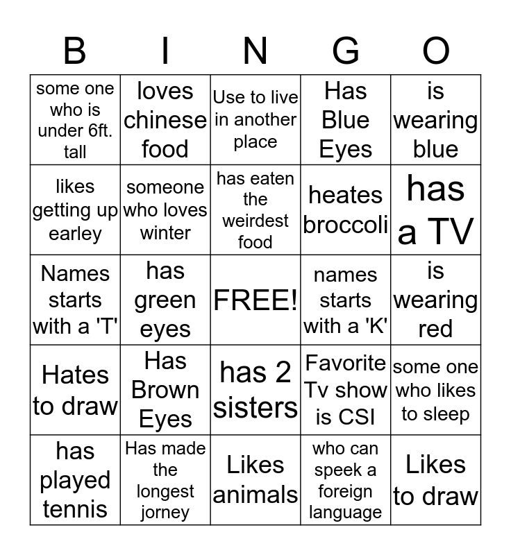This bingo card has a free space and 24 words: Has Brown Eyes, Has made the longest jorney, has eaten the weirdest food, has played tennis, is wearing blue, some one who is under 6ft. tall, likes getting up earley, loves chinese food, names starts with a 'K', has 2 sisters, heates broccoli, Names starts with a 'T', Favorite Tv show is CSI, some one who likes to sleep, someone who loves winter, who can speek a foreign language, is wearing red, Use to live in another place, has a TV, has green eyes, Likes to draw, Hates to draw, Has Blue Eyes and Likes animals.