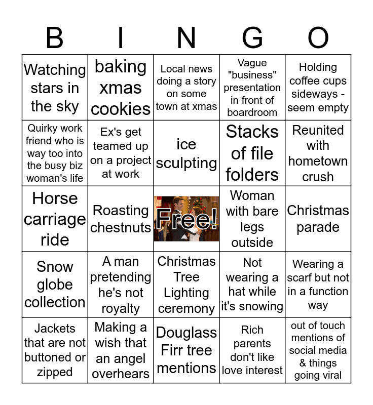 This bingo card has a free space and 24 words: A man pretending he's not royalty, Making a wish that an angel overhears, ice sculpting, Jackets that are not buttoned or zipped, Holding coffee cups sideways - seem empty, Watching stars in the sky, Quirky work friend who is way too into the busy biz woman's life, baking xmas cookies, Woman with bare legs outside, Christmas Tree Lighting ceremony, Stacks of file folders, Horse carriage ride, Not wearing a hat while it's snowing, Wearing a scarf but not in a function way, Ex's get teamed up on a project at work, Rich parents don't like love interest, Christmas parade, Local news doing a story on some town at xmas, Reunited with hometown crush, Roasting chestnuts, out of touch mentions of social media & things going viral, Snow globe collection, Vague "business" presentation in front of boardroom and Douglass Firr tree mentions.