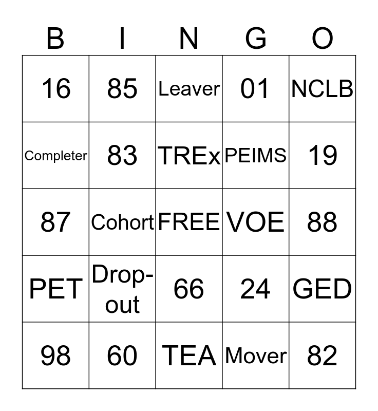 This bingo card has a free space and 24 words: Drop-out, 60, TREx, 98, NCLB, 16, Completer, 85, VOE, 66, PEIMS, 87, 24, GED, 83, Mover, 88, Leaver, 19, Cohort, 82, PET, 01 and TEA.