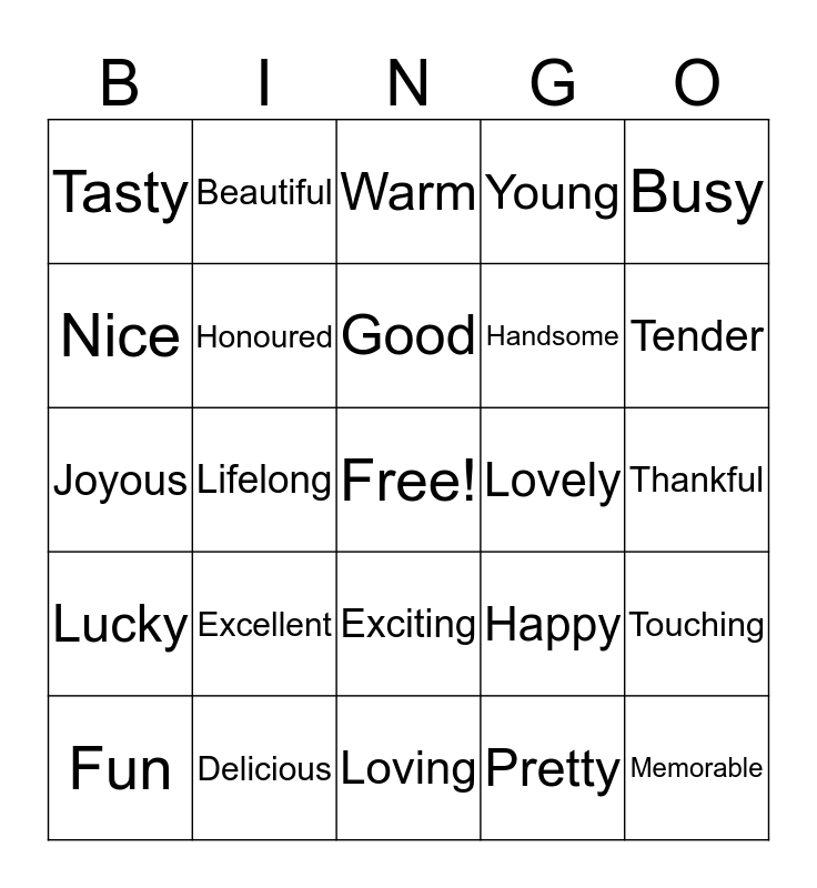 This bingo card has a free space and 24 words: Excellent, Delicious, Good, Fun, Busy, Tasty, Nice, Beautiful, Lovely, Exciting, Handsome, Joyous, Happy, Touching, Honoured, Pretty, Thankful, Warm, Tender, Lifelong, Memorable, Lucky, Young and Loving.