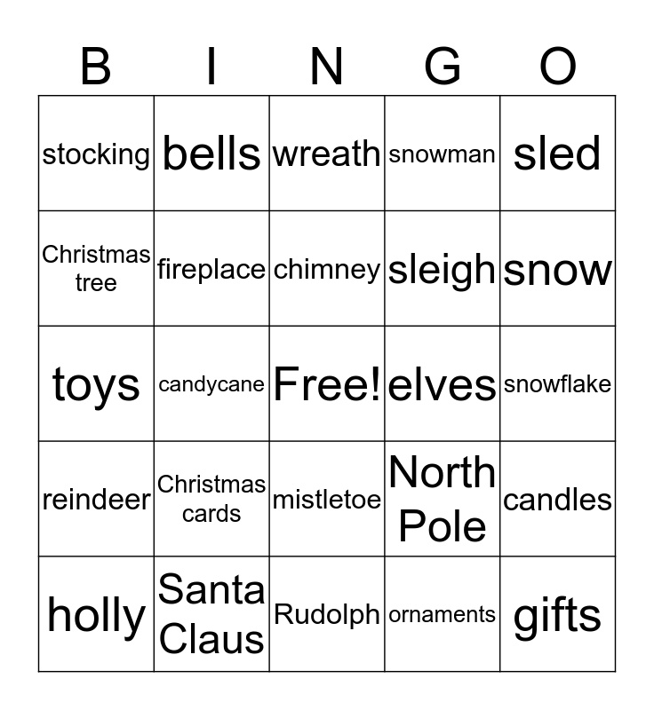This bingo card has a free space and 24 words: Christmas cards, Santa Claus, chimney, holly, sled, stocking, Christmas tree, bells, elves, mistletoe, sleigh, toys, North Pole, candles, fireplace, ornaments, snowflake, wreath, snow, candycane, gifts, reindeer, snowman and Rudolph.