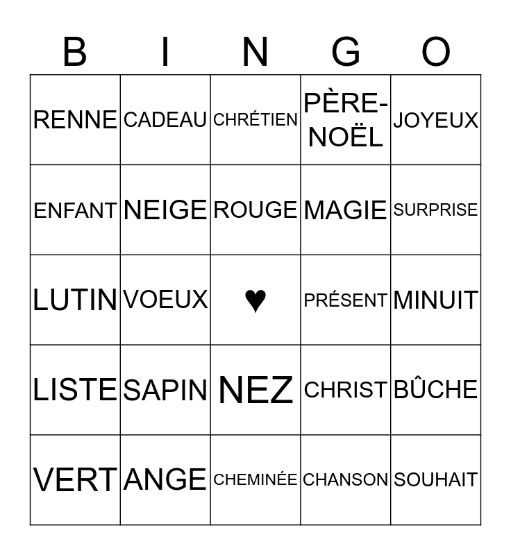 This bingo card has a free space and 24 words: SAPIN, ANGE, ROUGE, VERT, JOYEUX, RENNE, ENFANT, CADEAU, PRÉSENT, NEZ, MAGIE, LUTIN, CHRIST, BÛCHE, NEIGE, CHANSON, MINUIT, CHRÉTIEN, SURPRISE, VOEUX, SOUHAIT, LISTE, PÈRE-NOËL and CHEMINÉE.