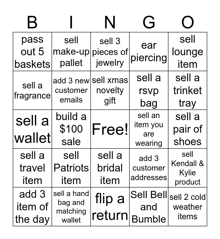 This bingo card has a free space and 24 words: add 3 item of the day, sell Patriots item, sell xmas novelty gift, Sell Bell and Bumble, sell lounge item, pass out 5 baskets, sell make-up pallet, sell 3 pieces of jewelry, sell an item you are wearing, sell a pair of shoes, sell a wallet, add 3 new customer emails, add 3 customer addresses, sell Kendall & Kylie product, sell a fragrance, sell a hand bag and matching wallet, flip a return, ear piercing, sell a trinket tray, sell a travel item, build a $100 sale, sell a bridal item, sell a rsvp bag and sell 2 cold weather items.