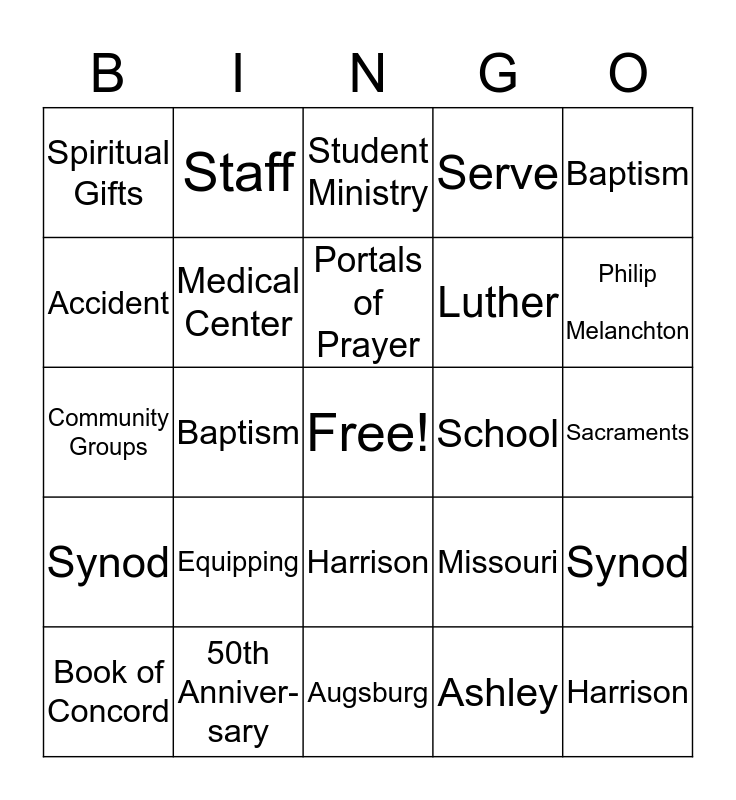 This bingo card has a free space and 24 words: Equipping, 50th Anniver- sary, Portals of Prayer, Book of Concord, Baptism, Spiritual Gifts, Accident, Staff, School, Harrison, Luther, Community Groups, Missouri, Synod, Medical Center, Ashley, Sacraments, Student Ministry, Philip Melanchton, Baptism, Harrison, Synod, Serve and Augsburg.