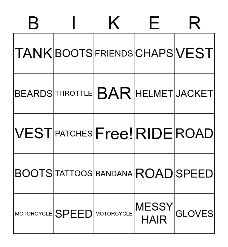 This bingo card has a free space and 46 words: HELMET, GLOVES, JACKET, MOTORCYCLE, TATTOOS, BANDANA, BOOTS, AMERICAN FLAG, BEARDS, HANDLE BARS, THROTTLE, CHAPS, SPEED, ROAD, SUNGLASSES, CLUB, BAR, RIDE, FRIENDS, VEST, PATCHES, MESSY HAIR, TANK, HELMET, GLOVES, JACKET, MOTORCYCLE, TATTOOS, BANDANA, BOOTS, AMERICAN FLAG, BEARDS, HANDLE BARS, THROTTLE, CHAPS, SPEED, ROAD, SUNGLASSES, CLUB, BAR, RIDE, FRIENDS, VEST, PATCHES, MESSY HAIR and SADDLE BAG.