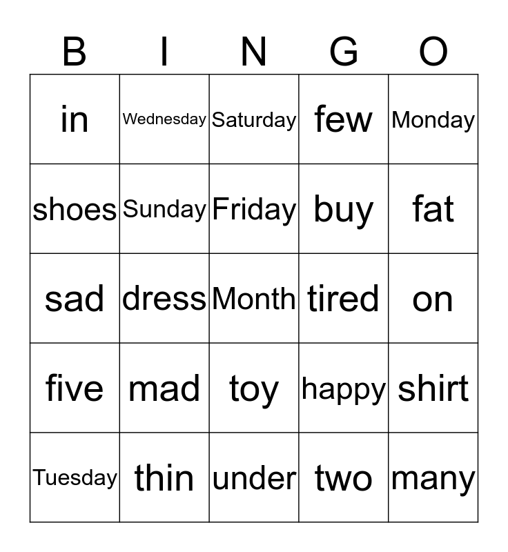 This bingo card has a free space and 34 words: one, two, three, four, five, Sunday, Monday, Tuesday, Wednesday, Thursday, Friday, Saturday, year, hungry, tired, fat, thin, sad, mad, happy, toy, garden, in, on, under, many, few, money, buy, shoes, hat, dress, shirt and jeans.