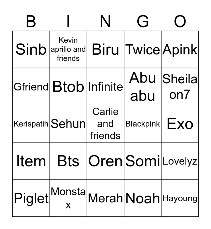 This bingo card has 25 words: Bts, Merah, Infinite, Piglet, Apink, Sinb, Gfriend, Kevin aprilio and friends, Blackpink, Oren, Abu abu, Kerispatih, Somi, Lovelyz, Btob, Hayoung, Exo, Biru, Sheila on7, Sehun, Carlie and friends, Monsta x, Item, Twice and Noah.