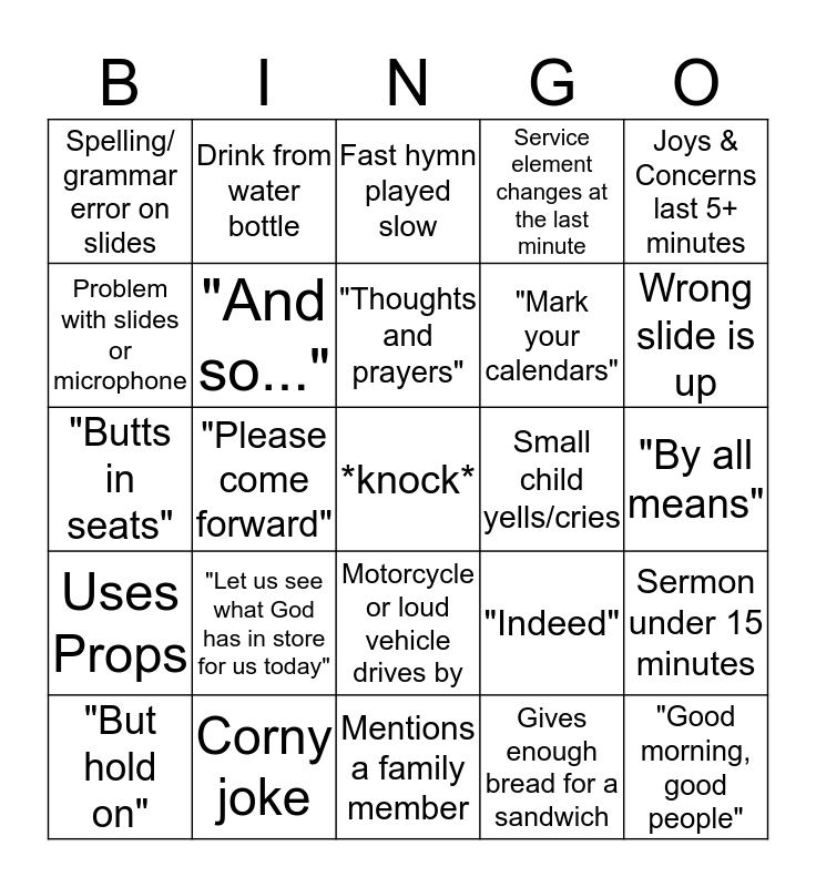 This bingo card has a free space and 24 words: "Let us see what God has in store for us today", Corny joke, "Thoughts and prayers", "But hold on", Joys & Concerns last 5+ minutes, Spelling/ grammar error on slides, Problem with slides or microphone, Drink from water bottle, Small child yells/cries, Motorcycle or loud vehicle drives by, "Mark your calendars", "Butts in seats", "Indeed", Sermon under 15 minutes, "And so...", Gives enough bread for a sandwich, "By all means", Fast hymn played slow, Wrong slide is up, "Please come forward", "Good morning, good people", Uses Props, Service element changes at the last minute and Mentions a family member.