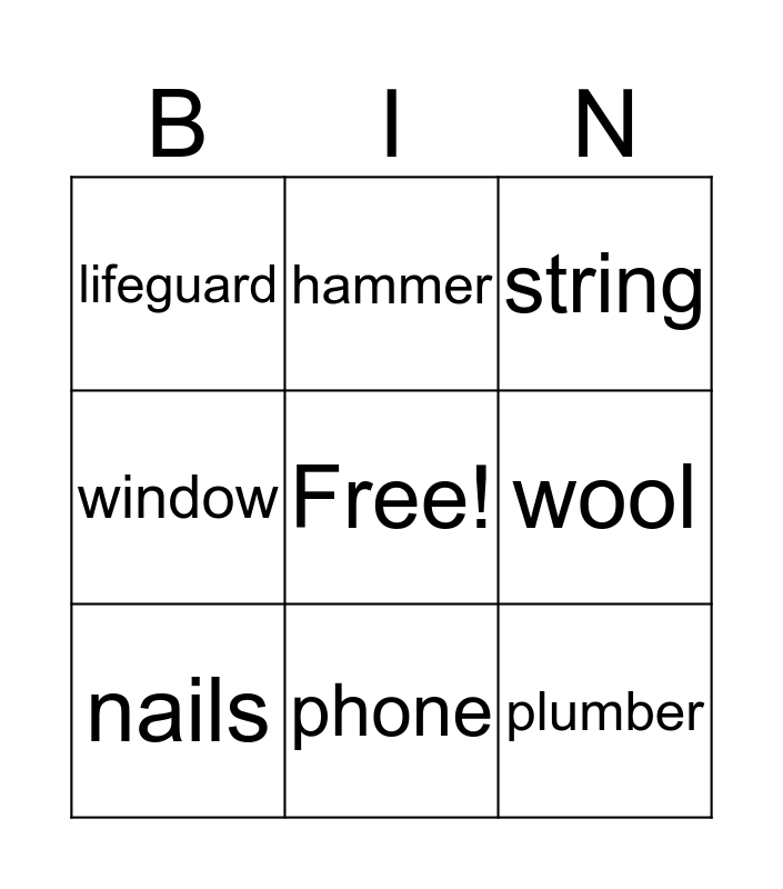 This bingo card has a free space and 28 words: axe, saw, wood, metal, wool, string, hammer, paper, scissors, rope, skittles, window, snow, log, pot, thunder, fish, nails, phone, camera, lifeguard, pilot, nurse, fireman, doctor, painter, plumber and carpenter.
