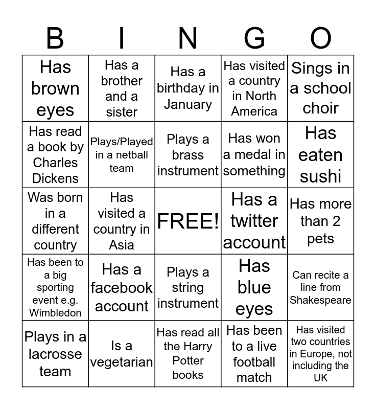 This bingo card has a free space and 39 words: Owns a pet dog, Owns a pet cat, Plays in a hockey team, Plays/Played in a netball team, Plays in a lacrosse team, Plays a string instrument, Plays a brass instrument, Plays a woodwind instrument, Sings in a school choir, Has been to a big sporting event e.g. Wimbledon, Has visited a country in Asia, Has visited a country in North America, Has visited two countries in Europe, not including the UK, Has more than 2 pets, Has a twitter account, Has a facebook account, Has appeared in a play at school, Has brown eyes, Has green eyes, Has blue eyes, Has read a book by Charles Dickens, Has read all the Harry Potter books, Has won a medal in something, Has eaten sushi, Is left handed, Can roll their tongue, Can say hello in 3 languages, Has met someone famous, Has NOT seen a Harry Potter film, Has a brother and a sister, Is wearing glasses, Has a birthday in September, Has a birthday in January, Is a vegetarian, Has been to a live football match, Can repeat 'Toy Boat' 5 times fast, Can recite a line from Shakespeare, Was born in a different country and Has NO brothers or sisters.