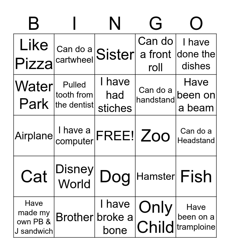 This bingo card has a free space and 24 words: Disney World, Brother, I have had stiches, Have made my own PB & J sandwich, I have done the dishes, Like Pizza, Water Park, Can do a cartwheel, Zoo, Dog, Can do a handstand, Airplane, Hamster, Fish, Pulled tooth from the dentist, Only Child, Can do a Headstand, Sister, Have been on a beam, I have a computer, Have been on a tramploine, Cat, Can do a front roll and I have broke a bone.