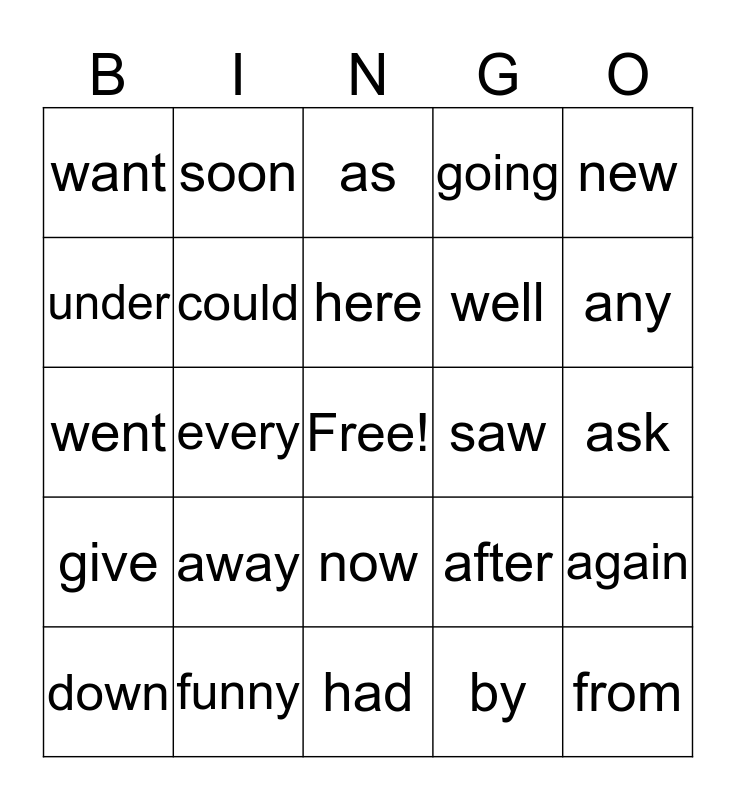 This bingo card has a free space and 24 words: away, funny, here, down, new, want, under, soon, saw, now, well, went, after, again, could, by, ask, as, any, every, from, give, going and had.